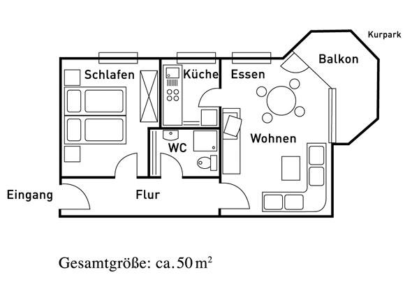 Die Wohnung (ca. 50 qm) besteht aus einem Wohn-Eßbereich, separaten Schlafraum, Küche, Dusche/WC und einem Balkon.